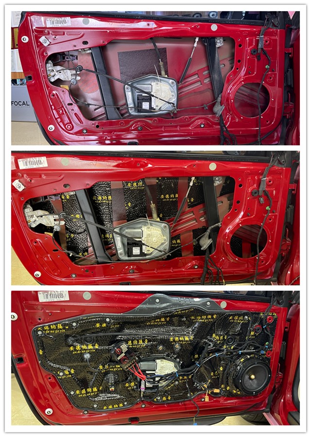 從圖中可見,原車門板未做任何隔音,沒有隔音會導致各種外界噪聲以及車門鈑金的共振聲都入侵到車廂內,環(huán)境嘈雜,喇叭不好發(fā)揮,從而聲音不夠清晰,不夠流暢。對此,改裝師使用安德納為門板做了雙層隔音,有效降噪減振 ,給喇叭發(fā)揮打下基礎。