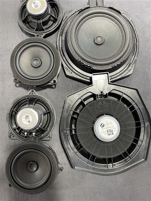 從原車拆下的4只中音喇叭,兩只低音喇叭,可以看出音盆用料差,做工粗糙