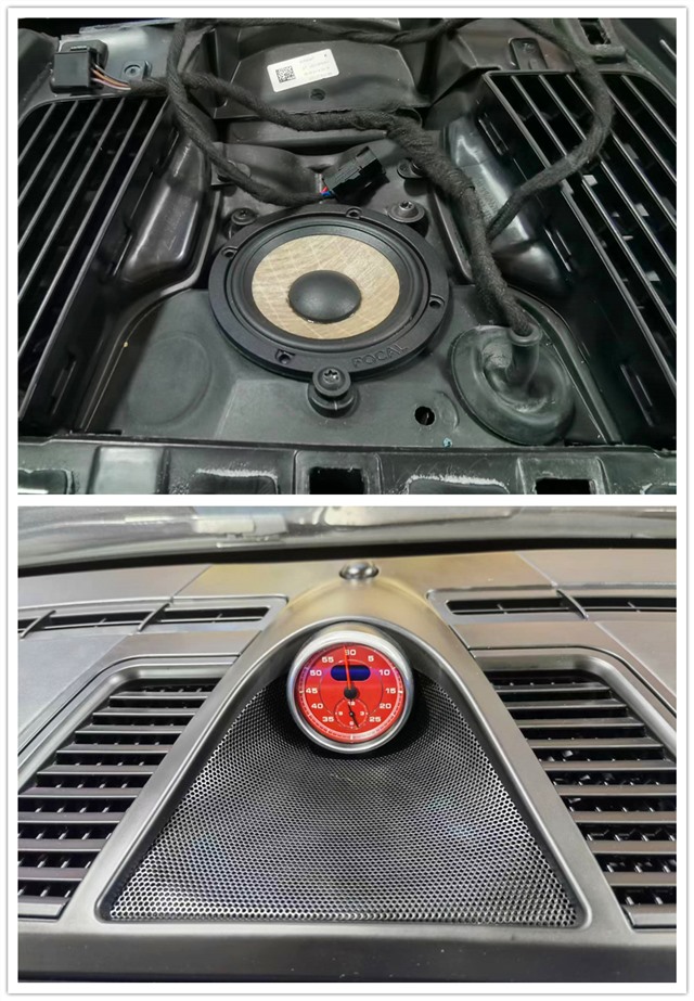 接下來,我們著手升級前聲場。針對保時捷車型,我們選擇了勁浪ISMBZ 100 兩分頻+一對勁浪 ISUB BMW4 低音,其高品質音色和精湛工藝,為前聲場提供了清晰、細膩、飽滿的聲音。中置位再加上3.5寸的勁浪亞麻中音協調配合,讓車主感受到音樂的真實和動感。