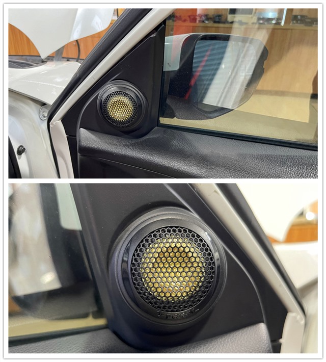 前聲場(chǎng)改裝的是法國(guó)勁浪ES165K兩分頻套裝喇叭。這款喇叭人聲還原度高,細(xì)節(jié)豐富,呈現(xiàn)的音樂(lè)極具現(xiàn)場(chǎng)感。改裝師將高音喇叭安裝在門(mén)板三角位,中低音喇叭原位無(wú)損安裝在前門(mén)板,憑借專(zhuān)業(yè)的技術(shù)使改裝后的喇叭和原車(chē)渾然一體。后聲場(chǎng)改裝的是法國(guó)勁浪PS 165 V1兩分頻,均衡車(chē)廂內(nèi)的聽(tīng)感,同時(shí)方便安裝,為車(chē)主節(jié)省時(shí)間。