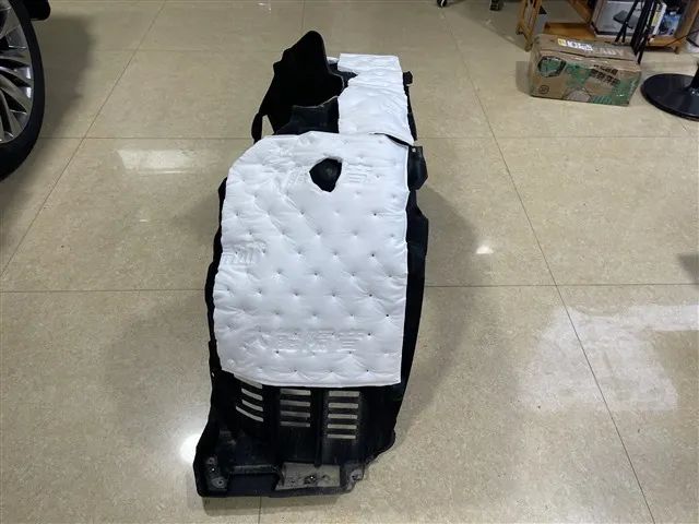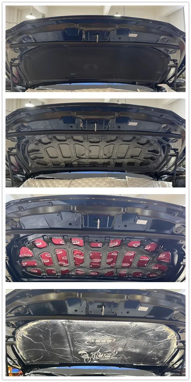 先看原車的引擎蓋,只有一層單薄的鐵皮結構,因此對引擎蓋做隔音是很有必要的。改裝師主要對引擎蓋做了雙層隔音處理,第一層使用大能紅派進行隔音止振,第二層使用大能銀衛士,阻隔發動機熱量烘烤引擎蓋漆面而導致老化,延長引擎蓋壽命,達到隔音的目的。