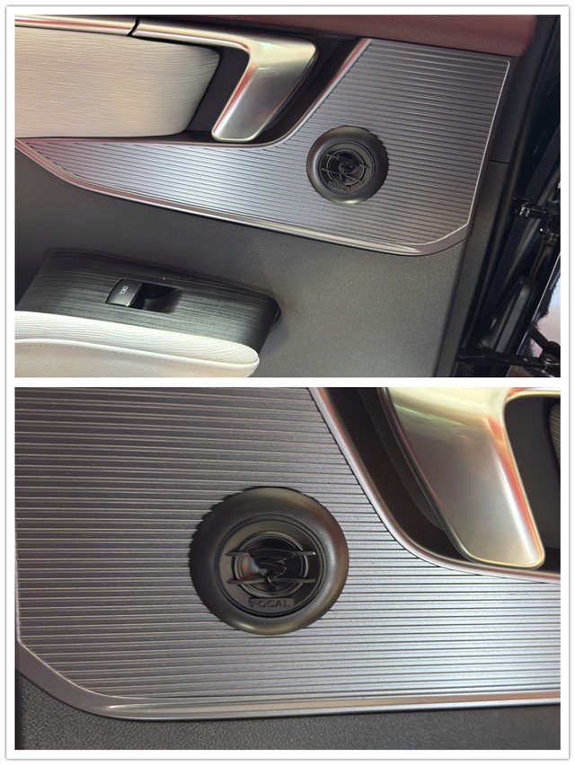 在升級音響前,改裝師先對四門進行專業隔音處理。選用的是大能超級盾隔音材料,有效降低風噪與共振,為音響系統營造一個干凈的聲學環境。前聲場選用法國勁浪S165FE亞麻兩分頻,以亞麻纖維為振膜核心材料,具有出色的聲音密度與細節表現力。高音安裝在A柱,實現精準的聲場定位;中低音無損安裝在前門板原位。