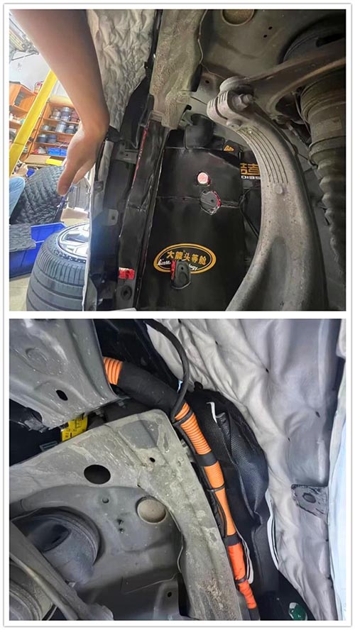 本次隔音升級的重點在于四輪,因為這是胎噪和路噪的主要來源。泉州海林專業改裝師根據極氪001的特點,制定了細致的四輪隔音方案,選用大能紅派、噪音終結者和超級溫莎棉等優質隔音材料,分層次進行處理,達到理想的隔音效果。