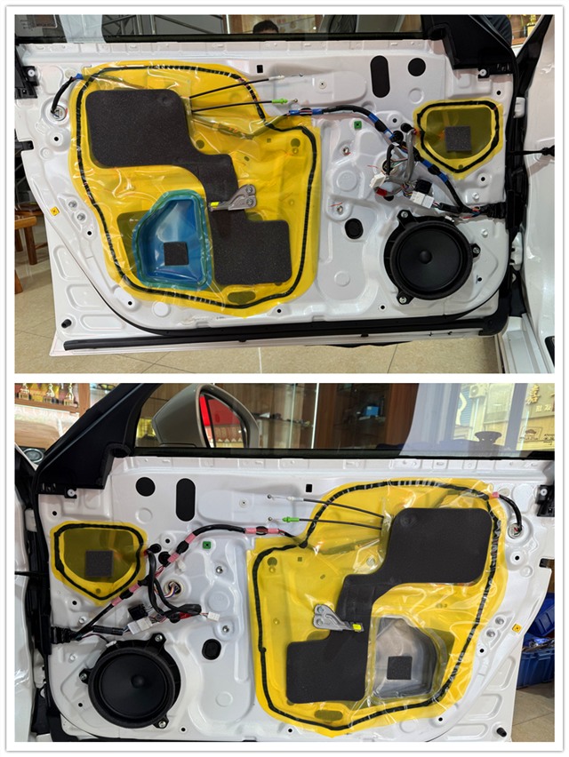 音質的提升離不開優質的隔音處理。這次我們采用了大能超級盾隔音材料,對門板進行了專業隔音處理。這不僅提升了車內的音響環境,還有效減少了行車噪音,為音響系統的表現提供了更為純凈的空間。