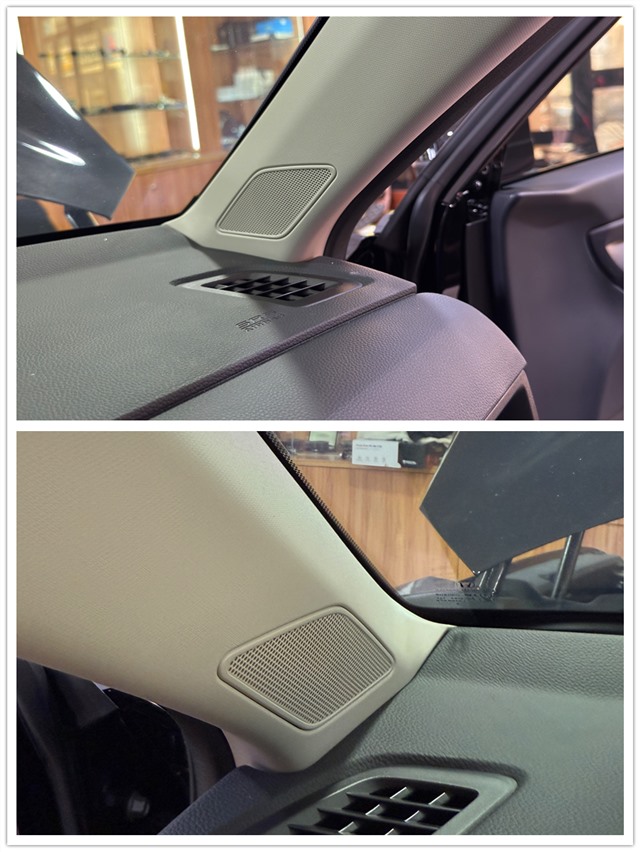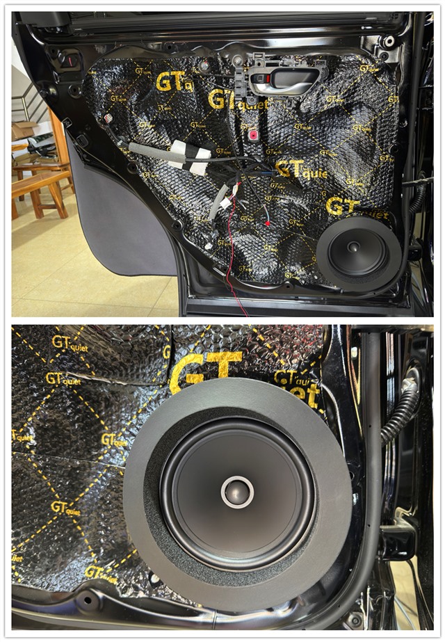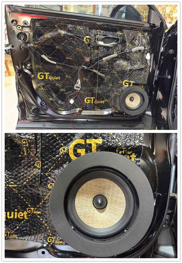 改裝的第一步,改裝師使用GT隔音材料對四門進行雙層隔音處理。不僅能降低車外噪音對車內的干擾,還能減少車門共振,提升喇叭的發(fā)聲效果,為后續(xù)的音響升級打下堅實基礎。前聲場選擇了勁浪PS 165 FXE兩分頻。這套喇叭采用亞麻纖維材質音盆,能夠呈現(xiàn)更加溫暖、飽滿的聲音效果。高音無損安裝在A柱,中低音則無損安裝在前門板,并加裝美音圈,進一步優(yōu)化發(fā)聲效果。