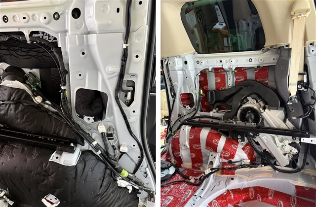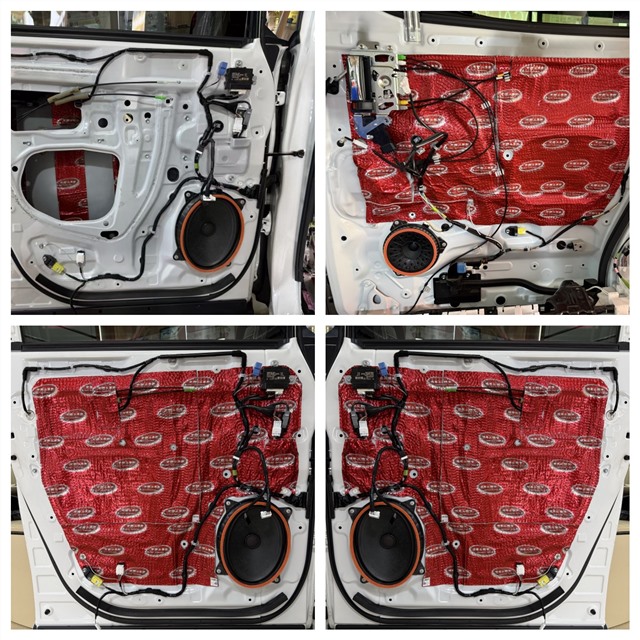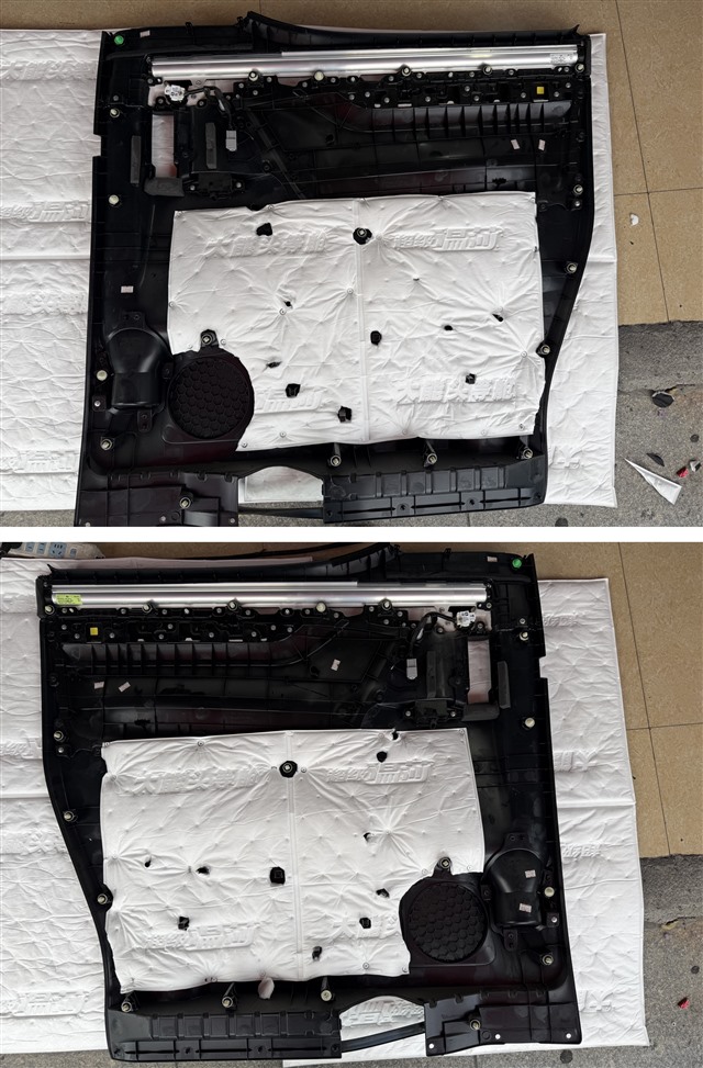 阿爾法原車門板內部僅有一層簡單的塑料防水膜,無法起到隔音作用。我們將其徹底清除,首先在內層鈑金緊貼一層 大能紅派,有效抑制車門共振。隨后,在外層再密封一層 紅派,形成一個扎實的箱體結構。這不僅大幅降低了風噪和外界環境音的傳入,更能讓車門變得更加厚實,關門聲更加沉穩。最后,在門板飾蓋上粘貼 超級溫莎,進一步吸收殘余噪音,并為音響系統提供一個更佳的工作環境。