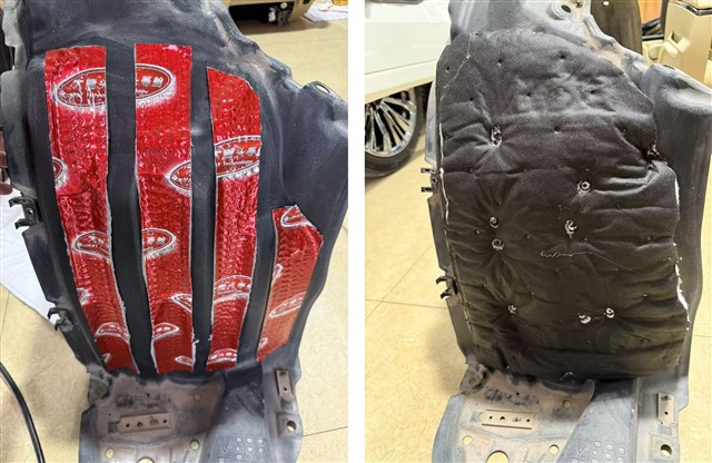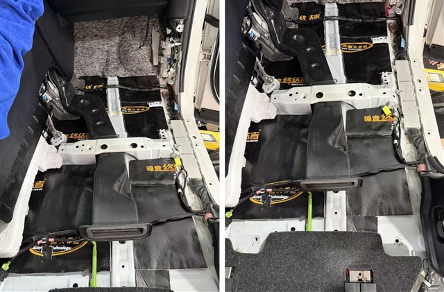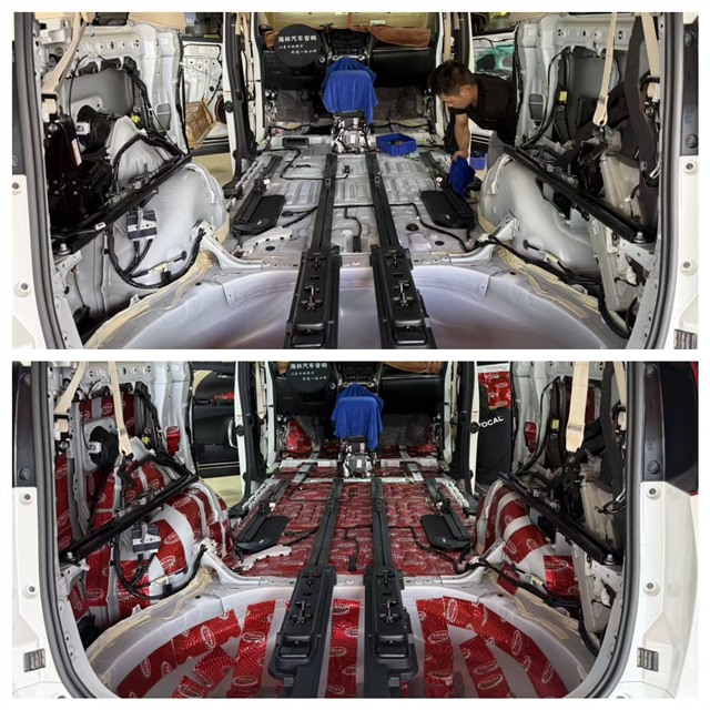 底盤是路噪和低頻共振的主要來源。我們將座椅、地毯等全部拆開,對裸露的鈑金進行徹底清潔。首先滿鋪 大能紅派 止振板,牢牢抑制住底盤的振動。隨后,在止振層之上再覆蓋一層 噪音終結者 吸音棉,將傳導至車內的中高頻路噪和輪胎噪音層層吸收、過濾。特別是駕駛員和乘客的 前腳踏 區域,這里是前輪噪傳入的主要路徑,我們同樣采用了 紅派+噪音終結者 的雙層處理,從源頭上阻隔煩人的路噪。