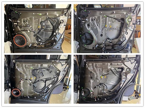 原車門板鐵皮結(jié)構(gòu)拆開后可以看到,門板的隔音措施較少,且有較多的空洞結(jié)構(gòu),風(fēng)噪和門板震動(dòng)的噪音很容易傳入車內(nèi)。因此,改裝師對(duì)門板進(jìn)行了三層隔音處理。這不僅能降低噪聲,還能增強(qiáng)鈑金剛性。改裝師先用大能紅派對(duì)門板進(jìn)行雙層隔音處理,主要起止振密封作用,再使用超級(jí)溫莎對(duì)門板飾蓋進(jìn)行第三層隔音處理。